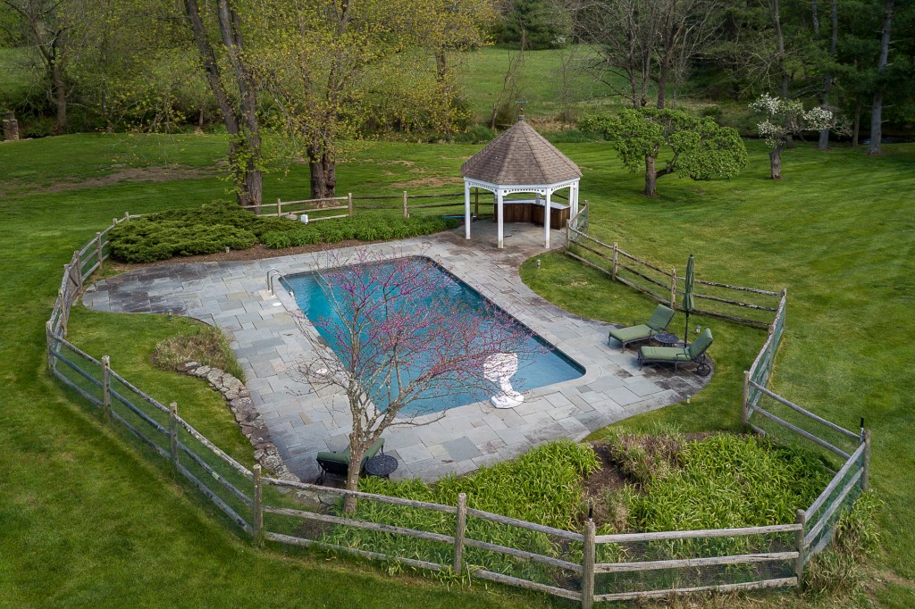 A renovated barn on the property is useful for all sorts of hobbies or an incredible extra entertaining space. The inviting pool area contains a gazebo providing cooling shade surrounded by open lawn and specimen plantings.