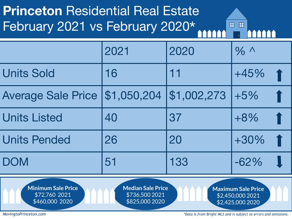 How does Princeton look year-to-date? More properties are selling at a faster rate compared to January and February of 2020. Units Sold were up +43% (33 vs. 23) and Units Listed were basically flat (-2%, 59 vs. 60) compared to the same period last year. Both the Average Sale Price (-8%, $1,022,347 vs. $1,110,580) and the Median Sale Price (-21%, $789,000 vs. $990,900) experienced a decrease. As you may recall the data is a bit skewed given the minimum sale price YTD is $72,760 compared to $427,000 last year and the maximum sale price is $2,450,000 versus $3,250,000. The Days on Market experienced a significant decrease (-31%, 81 vs. 128) over the same period last year.