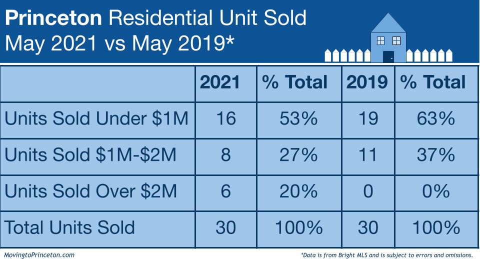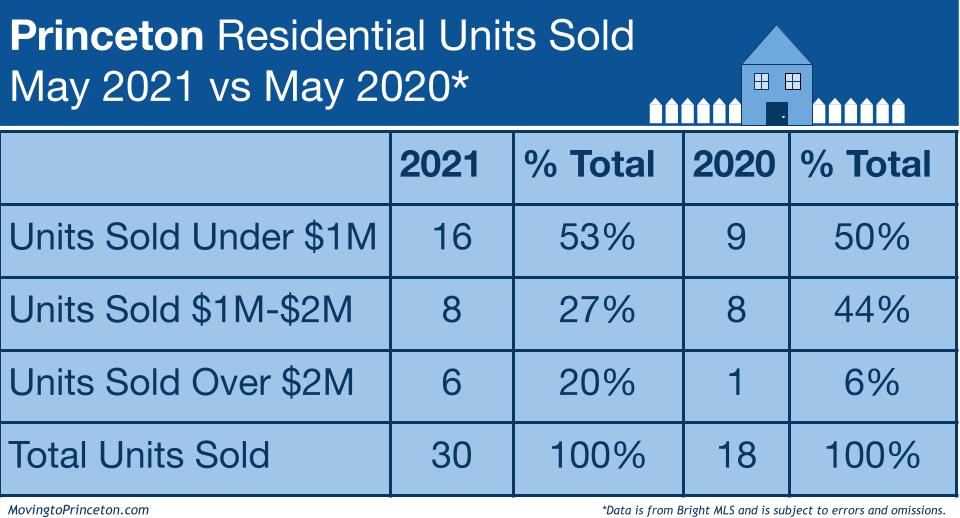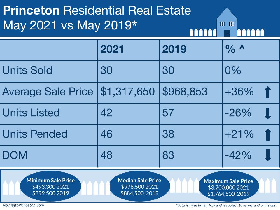How does Princeton look year-to-date? In January-May 2021, Units Sold were up (+73%, 121 vs. 70) as were Units Listed (+26%, 206 vs. 164). The Average Sale Price was also higher (+18%, $1,172,236 vs. $991,203) while the Days on Market decreased significantly (-44%, 62 vs. 111) compared to January-May of 2020. Additionally, through May 2021 the minimum sale price was $72,760 compared to $60,500 last year and the maximum sale price was $3,700,000 versus $3,250,000 during the same time last year.