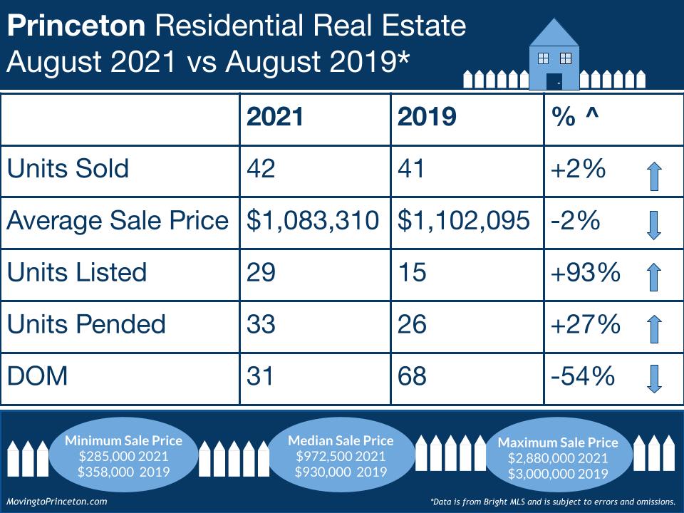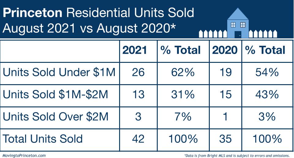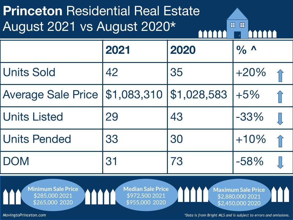 How does Princeton look year-to-date? January-August 2021, Units Sold were up (+45%, 251 vs. 173) as were Units Listed (+19%, 350 vs. 293). The ASP was also higher (+15%, $1,176,127 vs. $1,019,914) while DOM decreased materially (-40%, 49 vs. 81) compared to January-August of 2020. Additionally, through August 2021 the minimum sale price was $72,760 compared to $60,500 last year and the maximum sale price was $3,700,000 versus $3,250,000 during the same time last year. In summary, the 2021 year-to-date data shows that properties were selling more quickly, with more Units Listed, than during the same period last year.