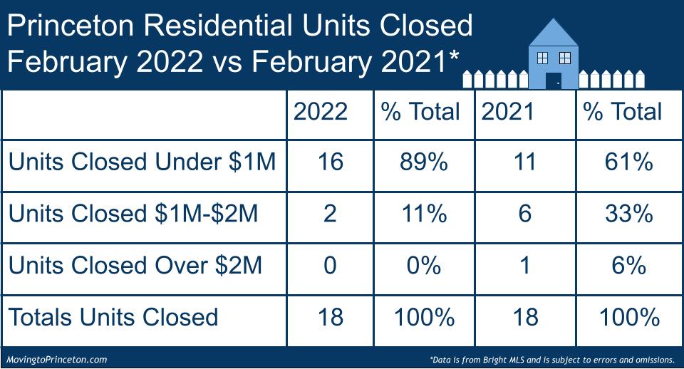 Now let’s take a look at how Princeton is performing year-to-date. Units Closed were up +23% (43 vs. 35) while Units Listed were down -12% (51 vs. 58) compared to the first two months of 2021. The ASP was effectively flat ($1,019,242 vs. $1,021,641) and DOM experienced a significant decrease (-33%, 52 vs. 78) over the same period last year.