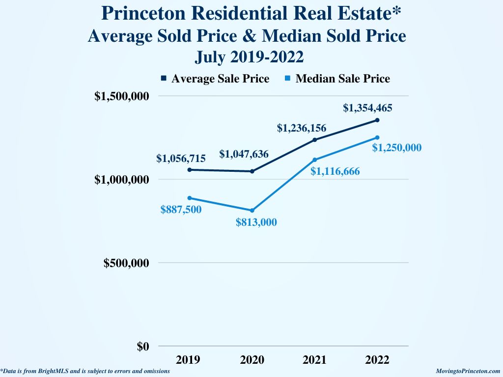 Now let’s take a look at how Princeton is performing year-to-date. Units Closed (-14%, 180 vs. 209), Units Listed (-20%, 257 vs. 320), and DOM (-33%, 35 vs. 52) all experienced a decrease compared to January-July 2021. The ASP (+2%, $1,221,432 vs. $1,194,903) and MSP (+2%, $1,027,500 vs. $1,010,000) increased at the same rate over the same period last year.