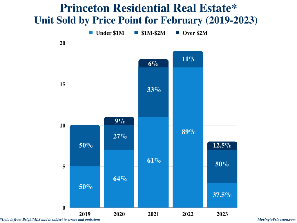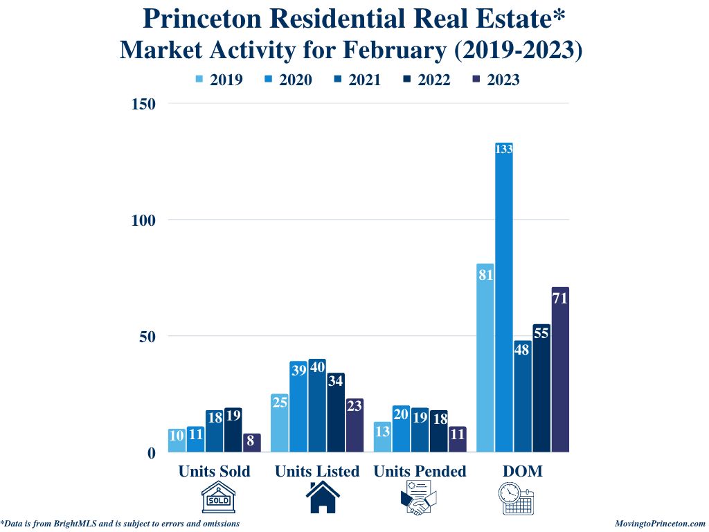 How is Princeton performing year-to-date (YTD)? Units Sold (-57%), Units Listed (-12%), and DOM (-8%) all decreased compared to January-February 2022. As for January-February 2023 versus January-February 2019, there was only a 2 unit decrease (-10%) in Units Sold but a 19 unit decrease (-30%) in Units Listed and a -39% decrease in DOM.