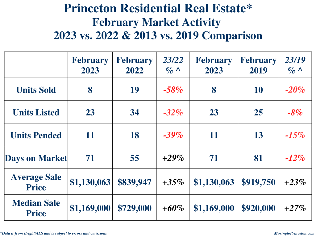 How is Princeton performing year-to-date (YTD)? Units Sold (-57%), Units Listed (-12%), and DOM (-8%) all decreased compared to January-February 2022. As for January-February 2023 versus January-February 2019, there was only a 2 unit decrease (-10%) in Units Sold but a 19 unit decrease (-30%) in Units Listed and a -39% decrease in DOM.