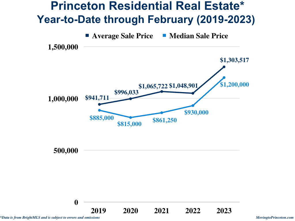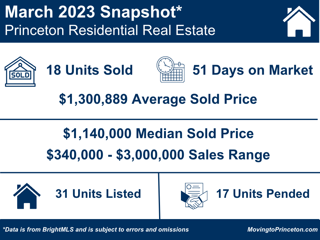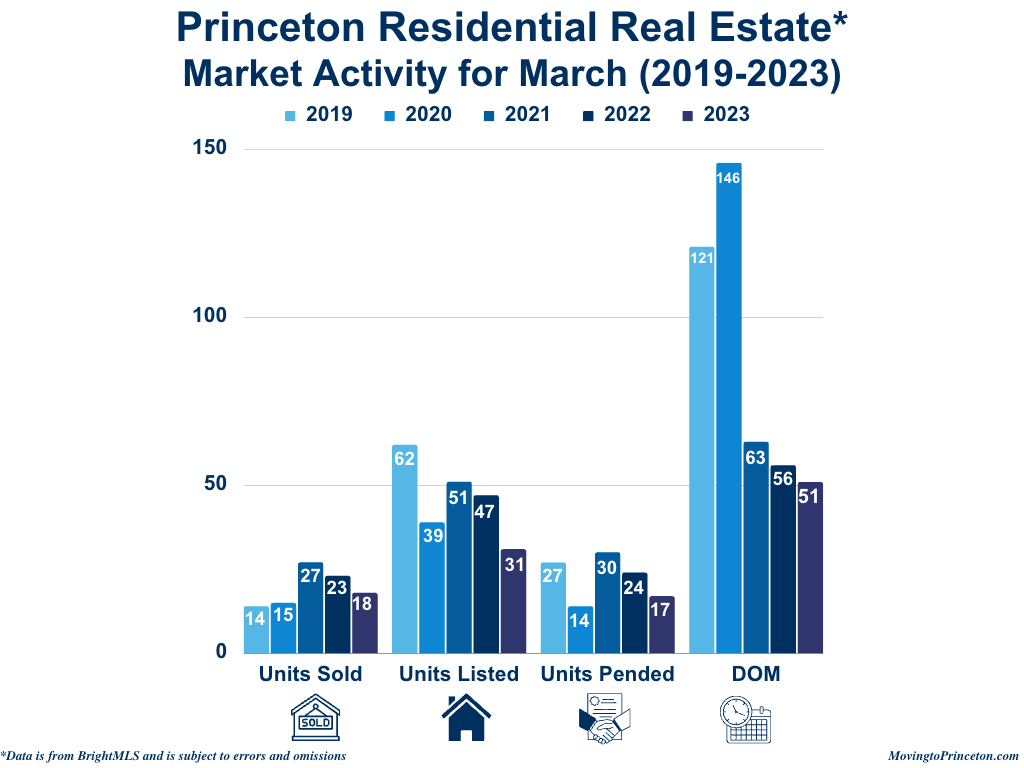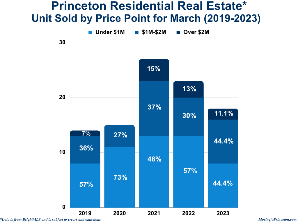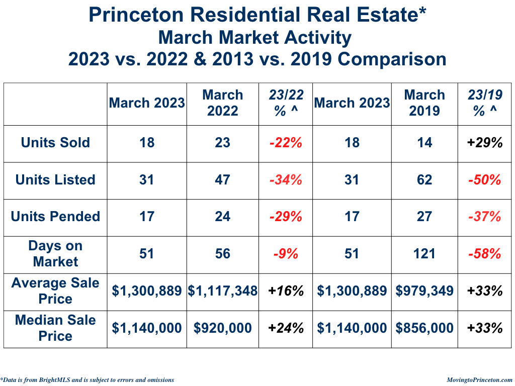 How is Princeton performing year-to-date (YTD)? Units Sold (-45%), Units Listed (-22%), and DOM (-8%) all decreased compared to January-March 2022. As for January-March 2023 versus January-March 2019, there was a 2 unit increase (+6%) in Units Sold, but a 50 unit decrease (-40%) in Units Listed and a -48% decrease in DOM (46 days). Again, it’s pretty remarkable that YTD more properties sold faster with considerably less inventory than in the same period in 2022.