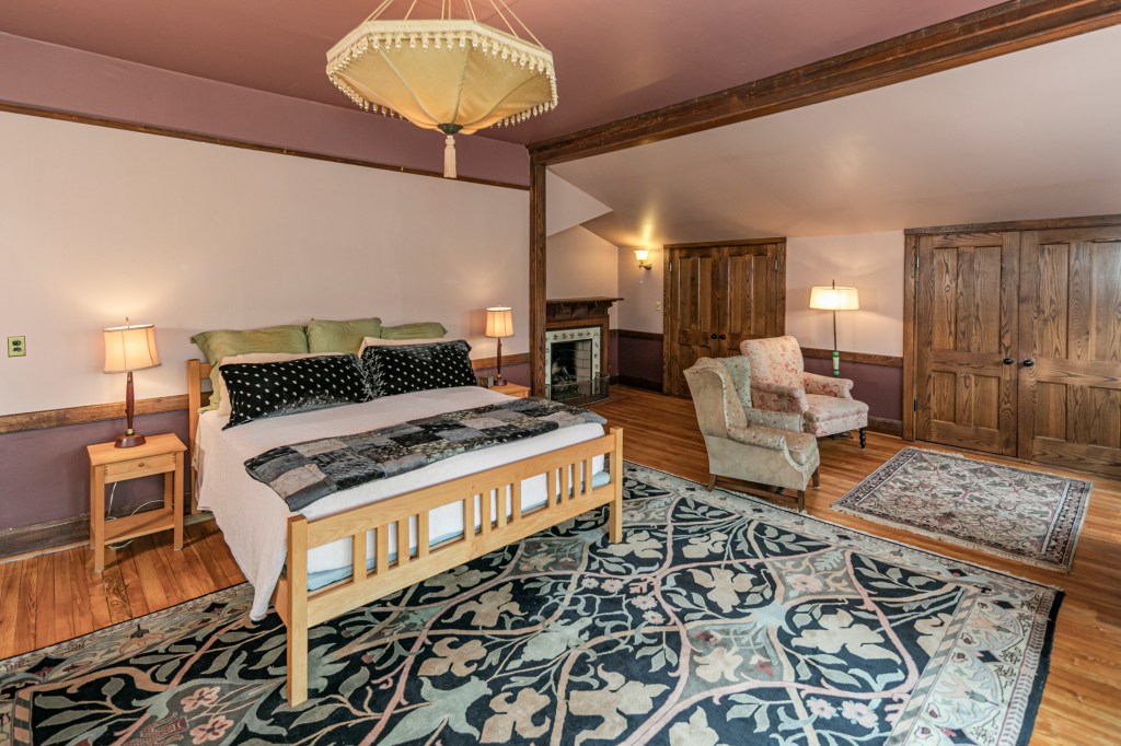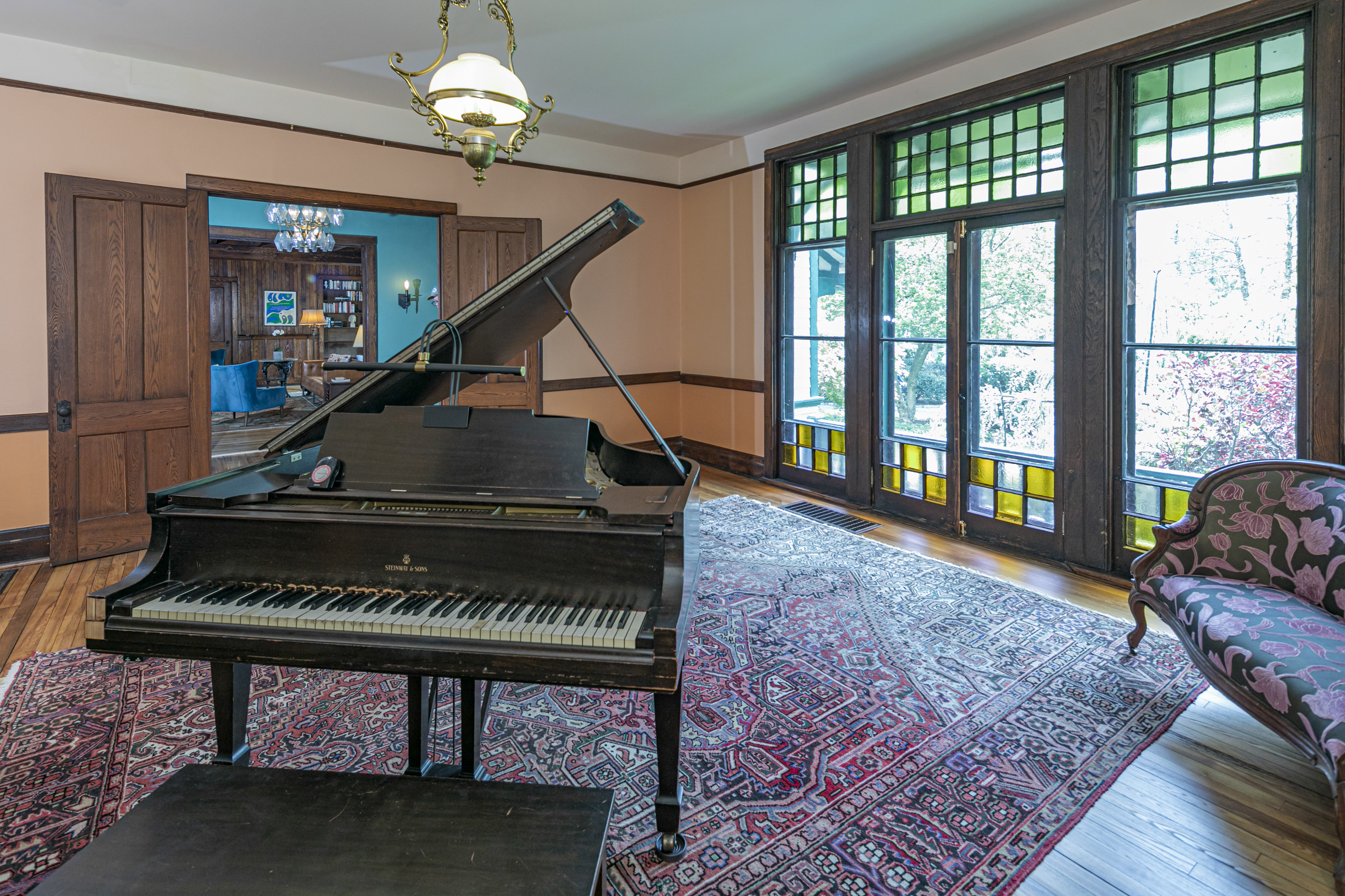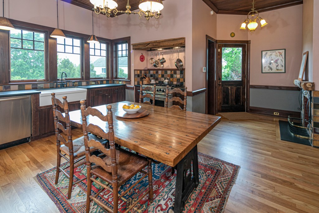 In updated areas, such as the kitchen, hand-milled black ash is a near match. Colors throughout the interior complement the textured cathedral glass decorating all south-facing windows, many of them painstakingly restored.