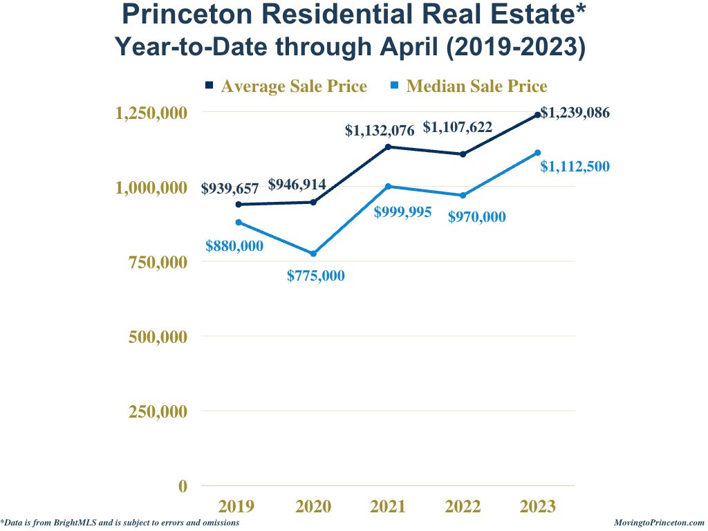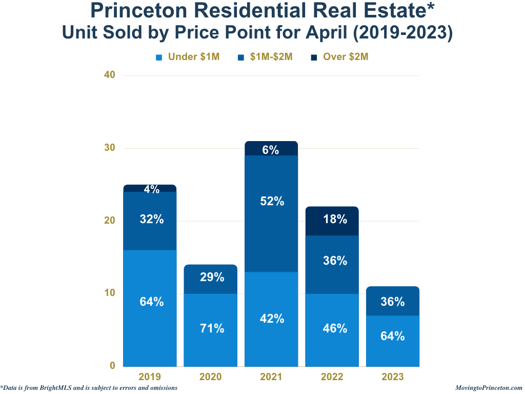 How is Princeton performing year-to-date (YTD)? Units Sold (-46%), Units Listed (-23%), and DOM (-2%) all decreased compared to January-April 2022. As for January-April 2023 versus January-April 2019 (pre-pandemic), Units Sold (-20%), Units Listed (-46%), and DOM (-46%) all decreased. While the low inventory this year is affecting both the number of sales and the DOM, the number of Units Sold is still pretty remarkable.