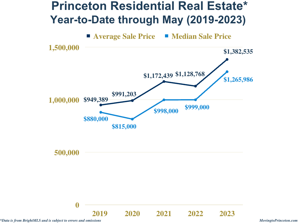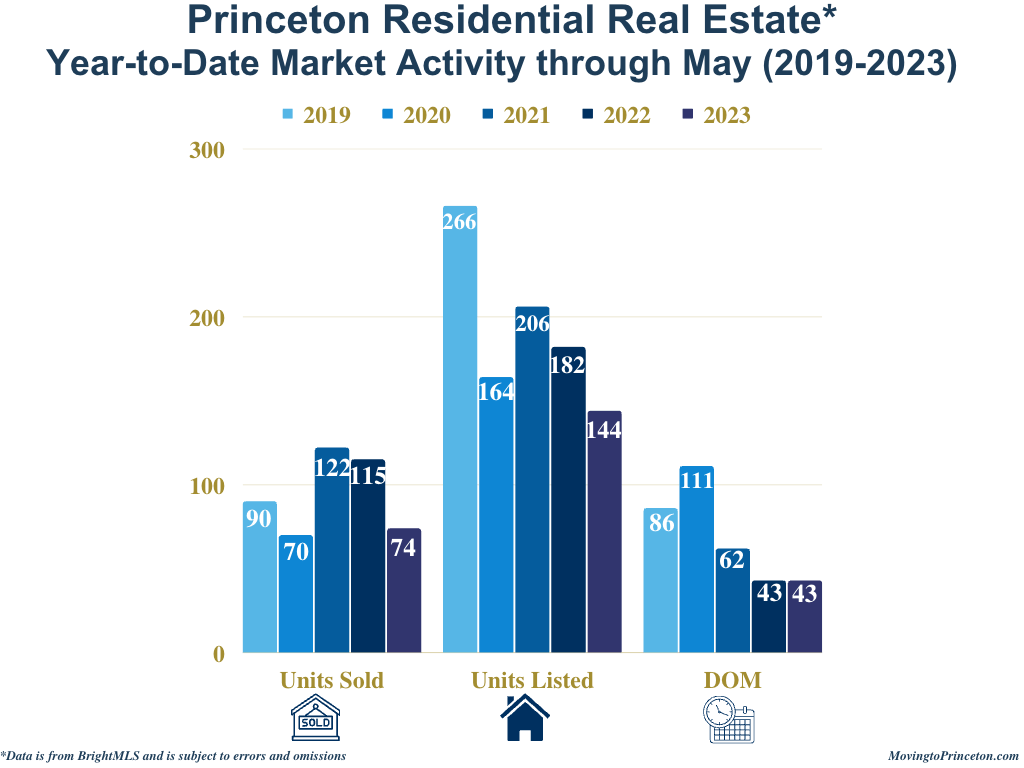 How is Princeton performing year-to-date (YTD)? Units Sold (-36%) and Units Listed both decreased while DOM remained flat (43 vs. 43) compared to January-May 2022. As for January-April 2023 versus January-May 2019 (pre-pandemic), Units Sold (-18%), Units Listed (-46%), and DOM (-50%) all decreased. The number of Units Sold is remarkable given the current inventory levels.