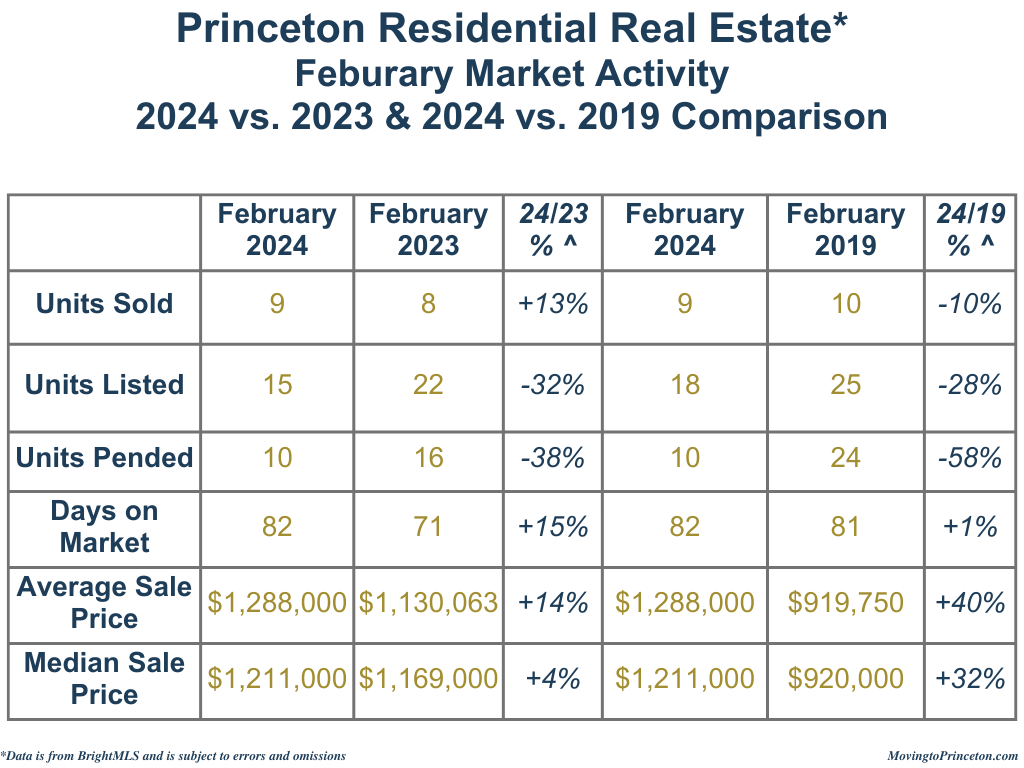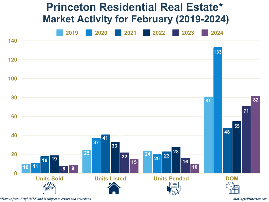 How is Princeton performing year-to-date (YTD)? Units Sold (-16%), Units Pended (-34%), and Units Listed (-41%) all decreased while DOM (+23%) increased compared to January-February 2023. As for January-February 2024 versus January-February 2019 (pre-pandemic), Units Sold (-24%), Units Pended (-40%), Units Listed (-58%), and Days On Market (-25%) all decreased. Year-to-date, there were fewer Units Pended because there were fewer Units Listed.