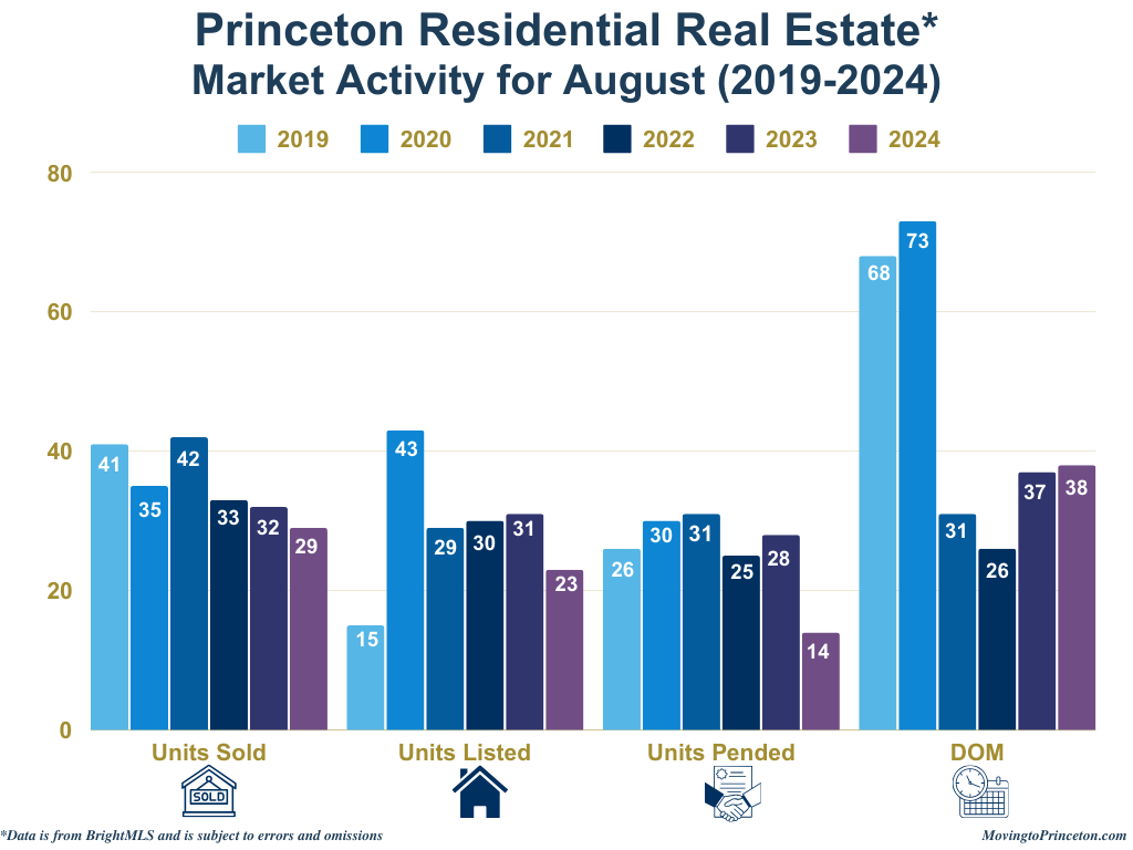Year-to-date, the market is effectively flat compared to last year, with Units Sold down by 1% and Units Listed down by 2%. However, there are greater decreases in Units Pended (-4%) and DOM (-5%). When comparing January-August 2024 to the same period in 2019, Units Sold have dropped significantly by 20%, Units Listed by 36%, and Units Pended by 22%, while DOM has decreased by 51%. While the market is flat year-to-date compared to last year, it is operating with reduced inventory and a quicker turnover of properties.