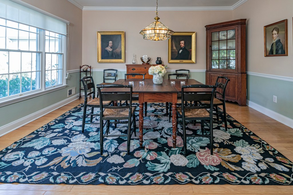 This sun-filled home boasts an open-concept layout on a serene lot, complete with a spacious terrace perfect for outdoor relaxation. The elegant dining room, with its gleaming wood floors, greets you near the impressive entryway.