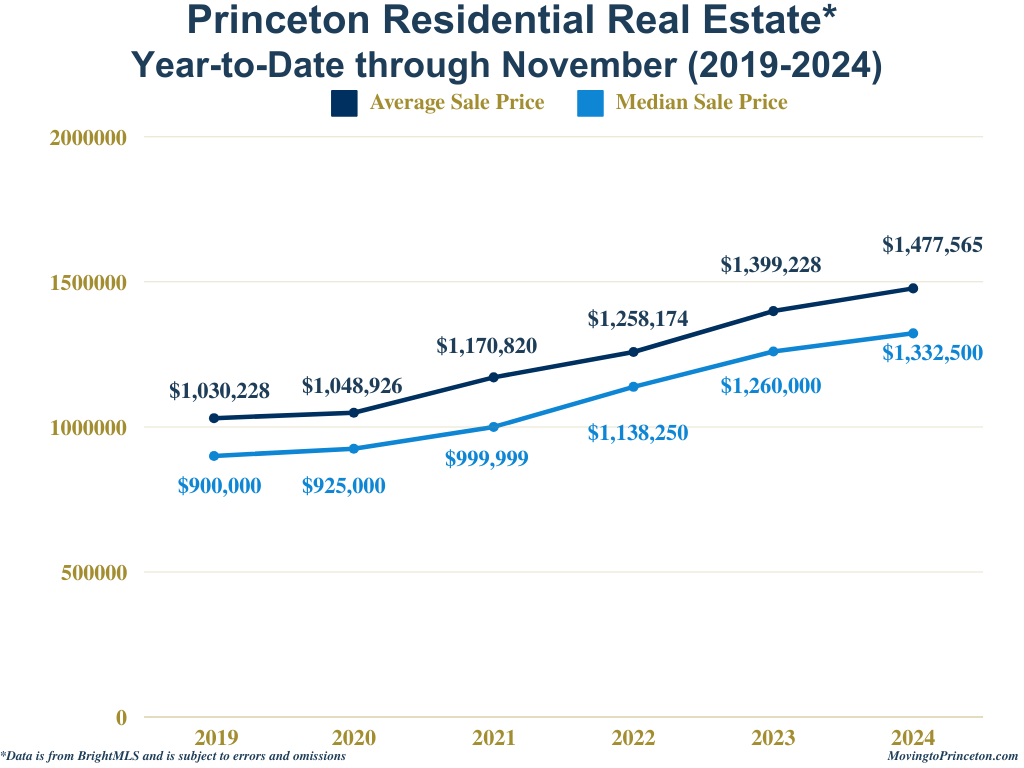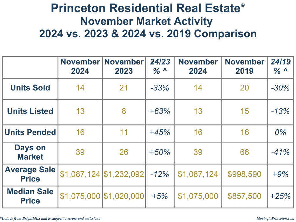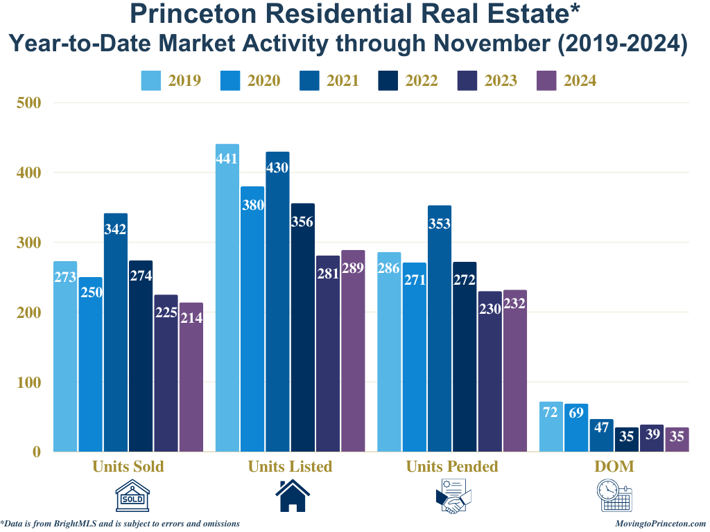 Year-to-date, the Princeton residential real estate market has remained active and relatively stable compared to 2023, with a slight 5% decrease in Units Sold, a 3% increase in Units Listed, and Units Pended remaining effectively flat. The market also saw a 10% decrease in DOM. However, when comparing January–November 2024 to the same period in 2019, the market shows notable declines across the board: Units Sold are down by 22%, Units Pended by 19%, Units Listed by 34%, and DOM by 51%. While 2024’s market shows moderate changes from last year, comparing it to 2019 reveals fewer homes sold, reduced inventory, and faster transaction times.