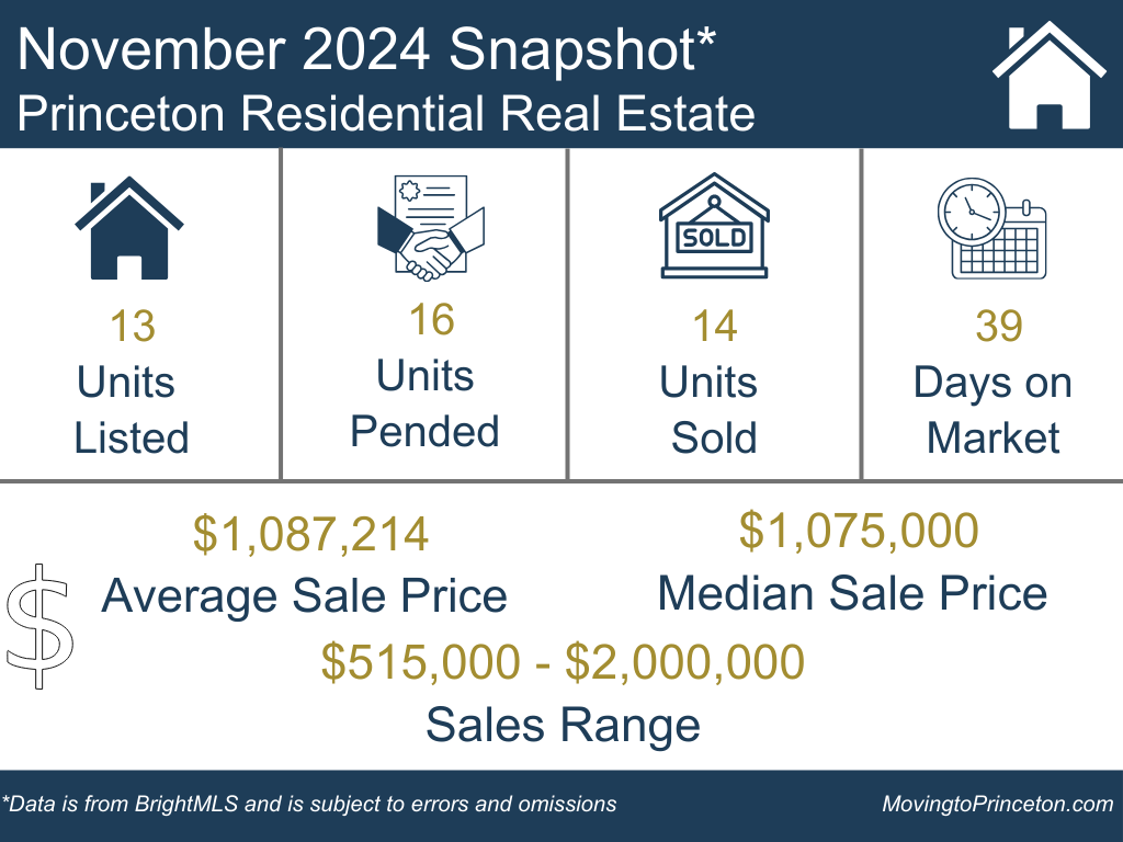 November data indicates that the Princeton residential real estate market may be undergoing a recalibration. Units Sold dropped significantly (-33%), while Units Listed (+63%) and Units Pended (+45%) showed material increases. The average Days on Market (DOM) grew by 50% to 39 days—still relatively quick but potentially reflective of a shifting dynamic. It remains a sellers’ market; however, the data points toward a gradual move toward a more balanced market, with increasing inventory and longer transaction timelines.
