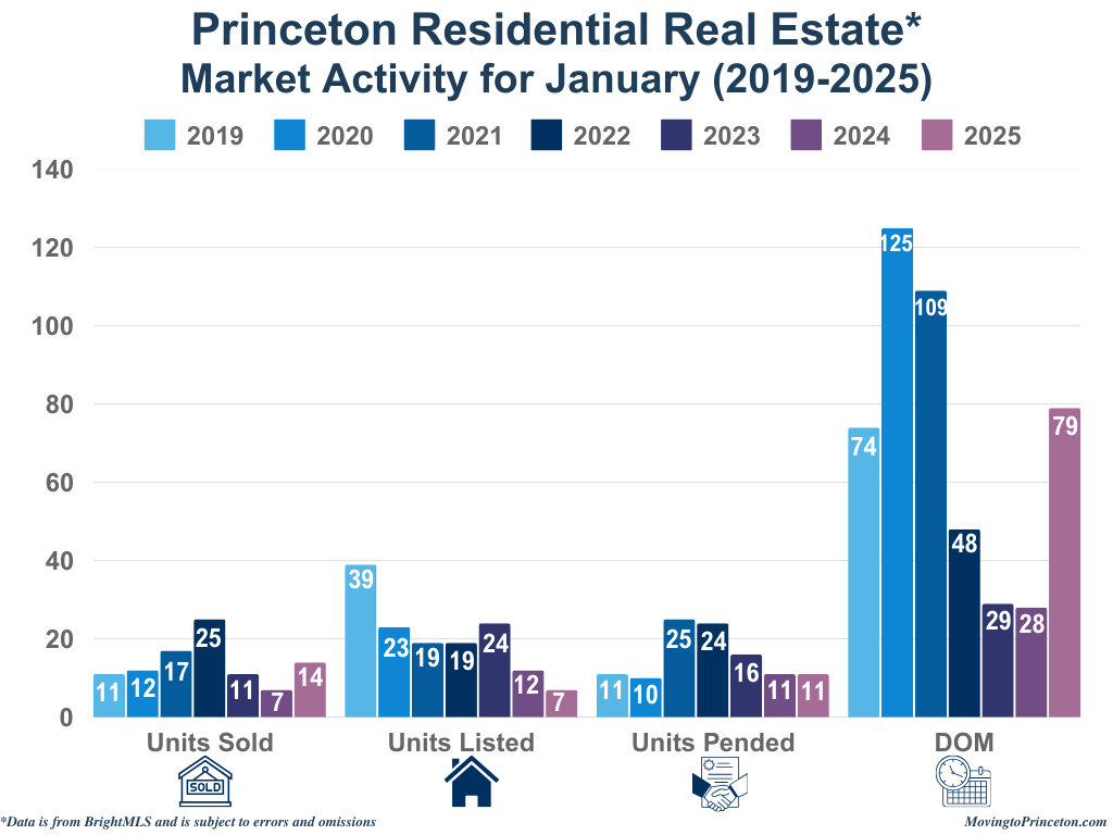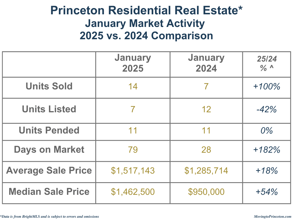 Demand remained strong in January 2025, with a 100% increase in Units Sold, while Units Pended held steady despite a 42% decline in new listings compared to January 2024. Given the lower inventory levels, it’s no surprise that both the Average Sale Price and Median Sale Price rose by 18% and 54%, respectively, year-over-year. The Average Days on Market (DOM) returned to pre-pandemic levels. While Princeton’s residential real estate market continues to demonstrate resilience, new inventory is needed.