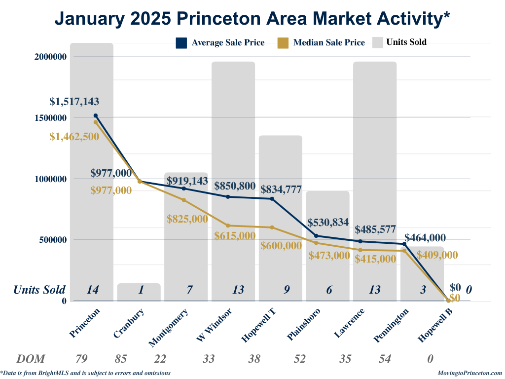 As in my year-in-review, below is a brief analysis of the broader Princeton area markets. In January 2025, Princeton recorded the highest Average and Median Sale Prices, followed by Cranbury and Montgomery Township. Princeton also led in Units Sold (14), with West Windsor and Lawrence Township closely behind (13 each). The fastest Days on Market (DOM) was seen in Montgomery (22 days), followed by West Windsor (33 days). Overall, Princeton led in both pricing and sales activity in January 2025.