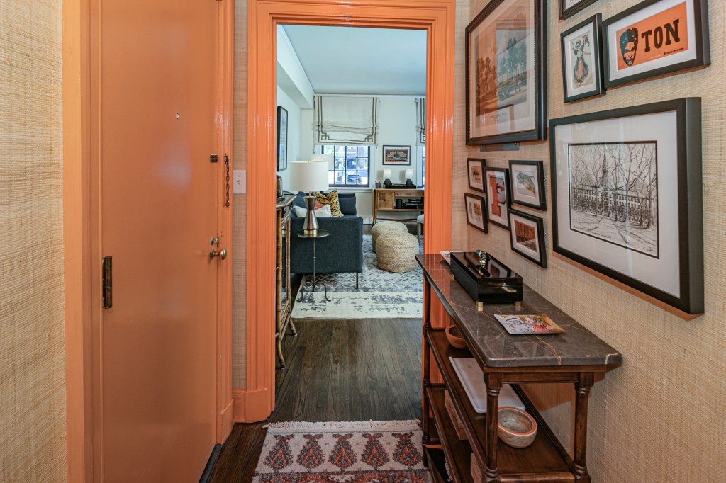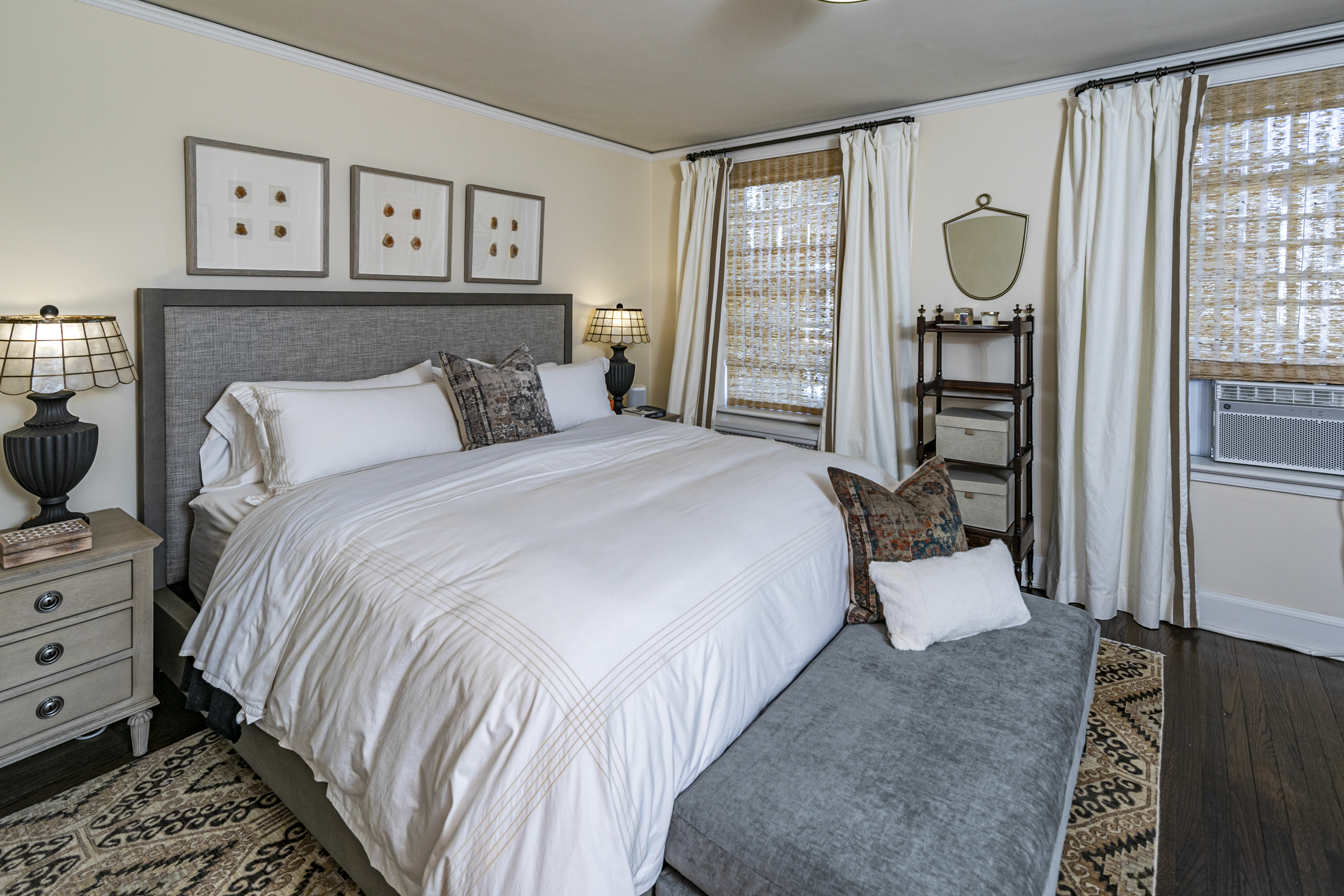 A proper foyer with grasscloth-covered walls gives the bedroom a bit of welcome separation. Indulge in a king-sized bed, along with any other must-have accoutrement to make your morning routine complete.