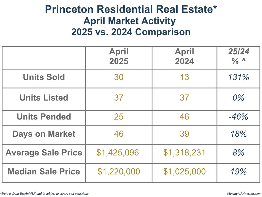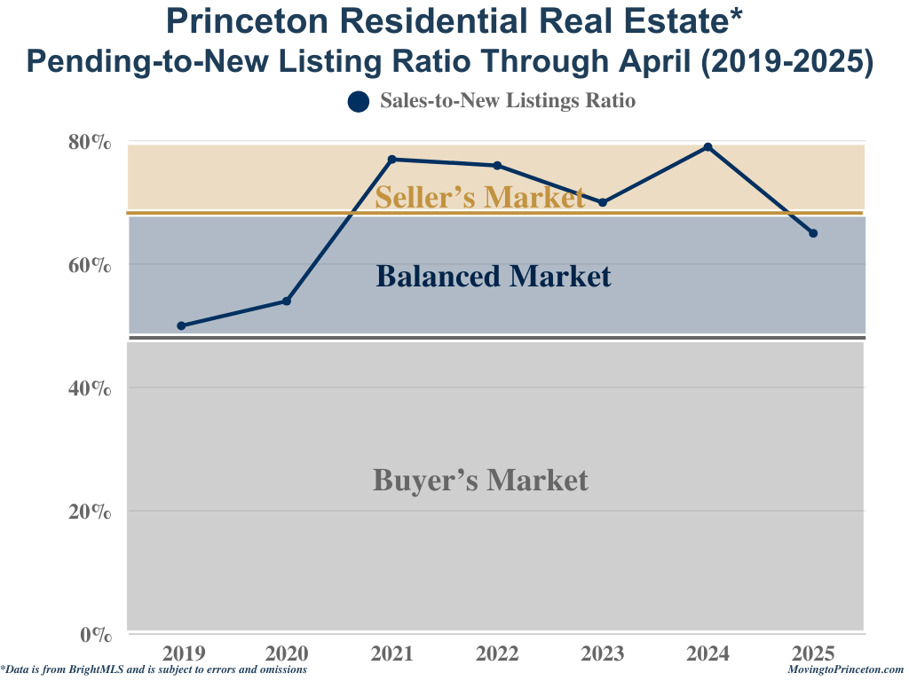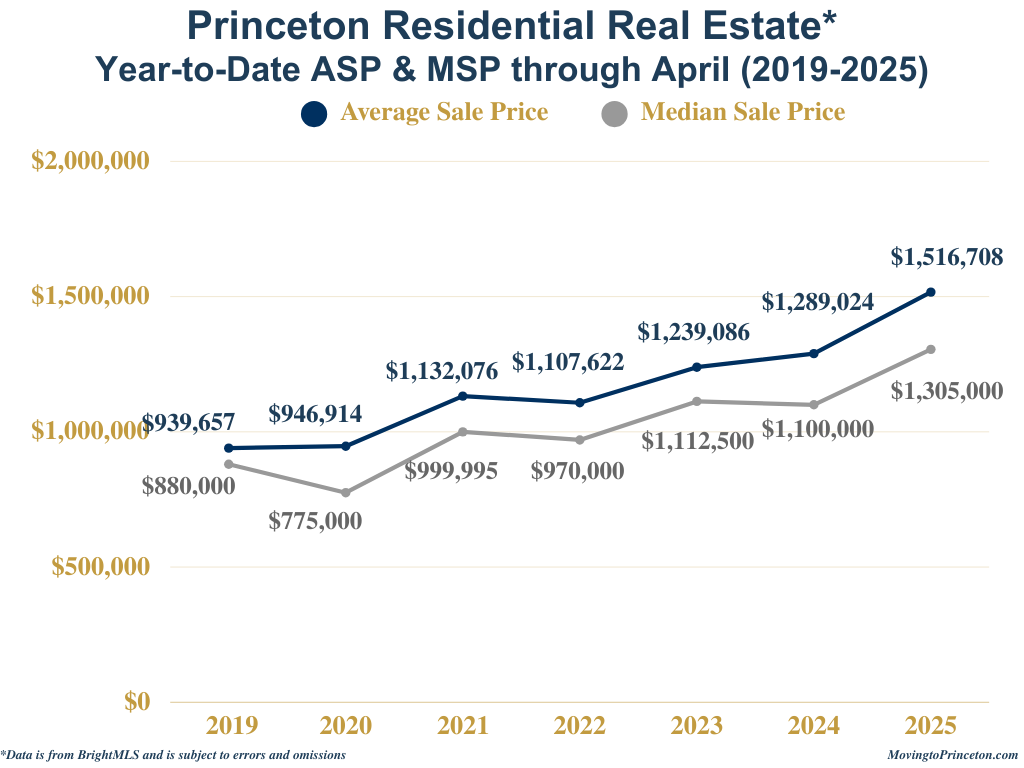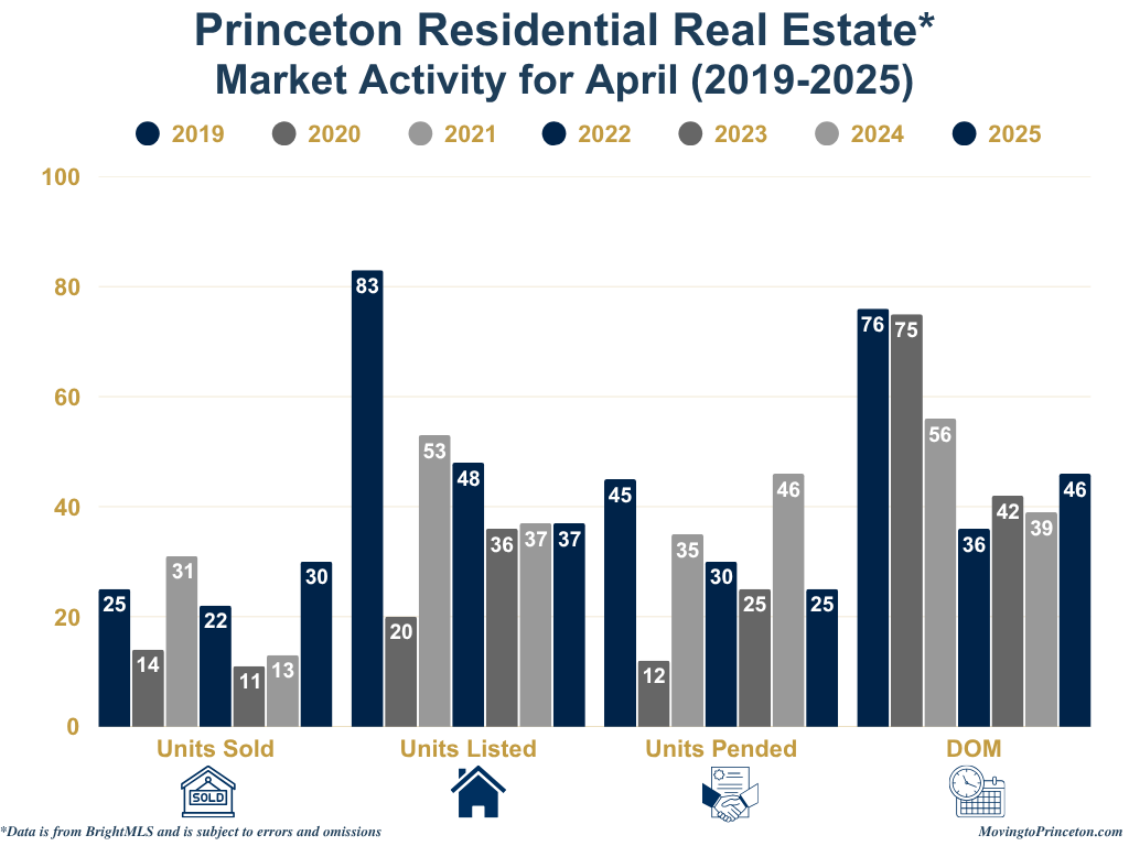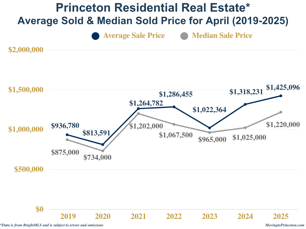 To put April’s numbers in a broader context, it’s helpful to consider how Princeton’s market has evolved over the past seven years. Compared to pre-pandemic norms, inventory this April remained historically low, while sales volume nearly matched the 2021 highs, a peak year fueled by pandemic-driven demand. Despite the strong pace of closings, the decline in new contracts in April 2025 may signal a market at an inflection point or reflect a seasonal pause. Whether this trend continues or picks up again will become clearer in the months ahead.