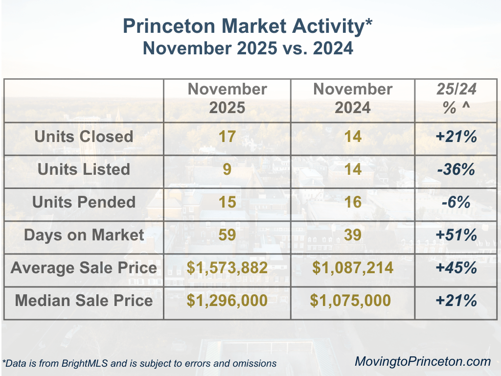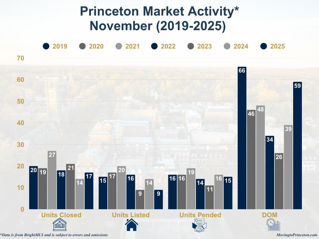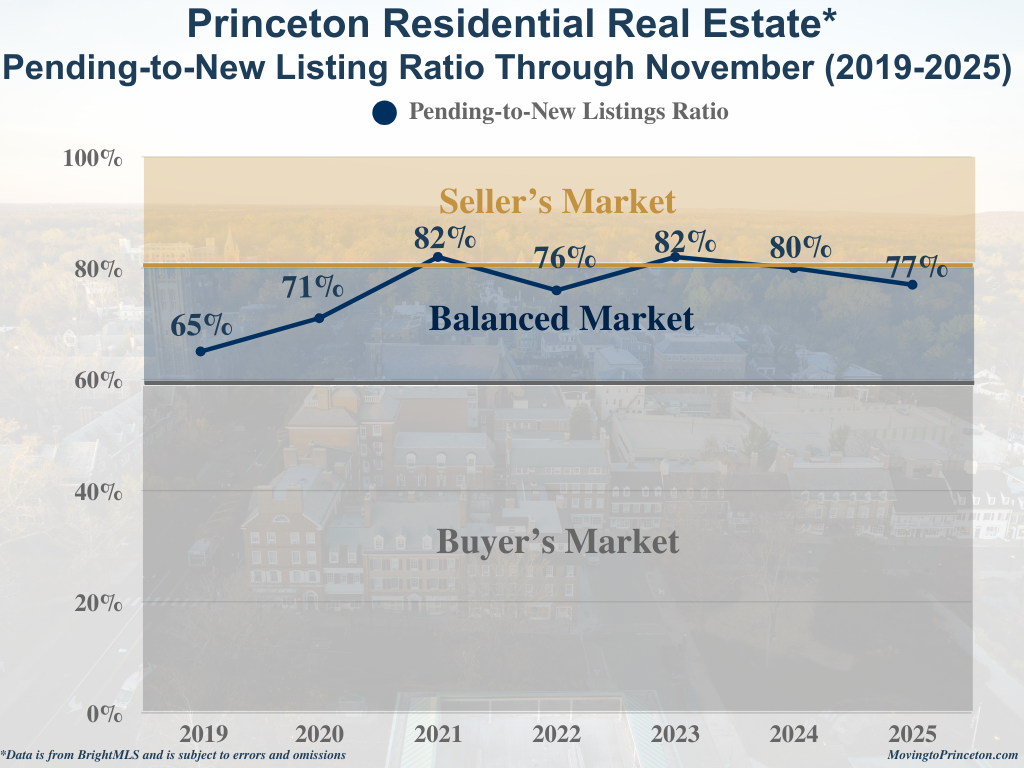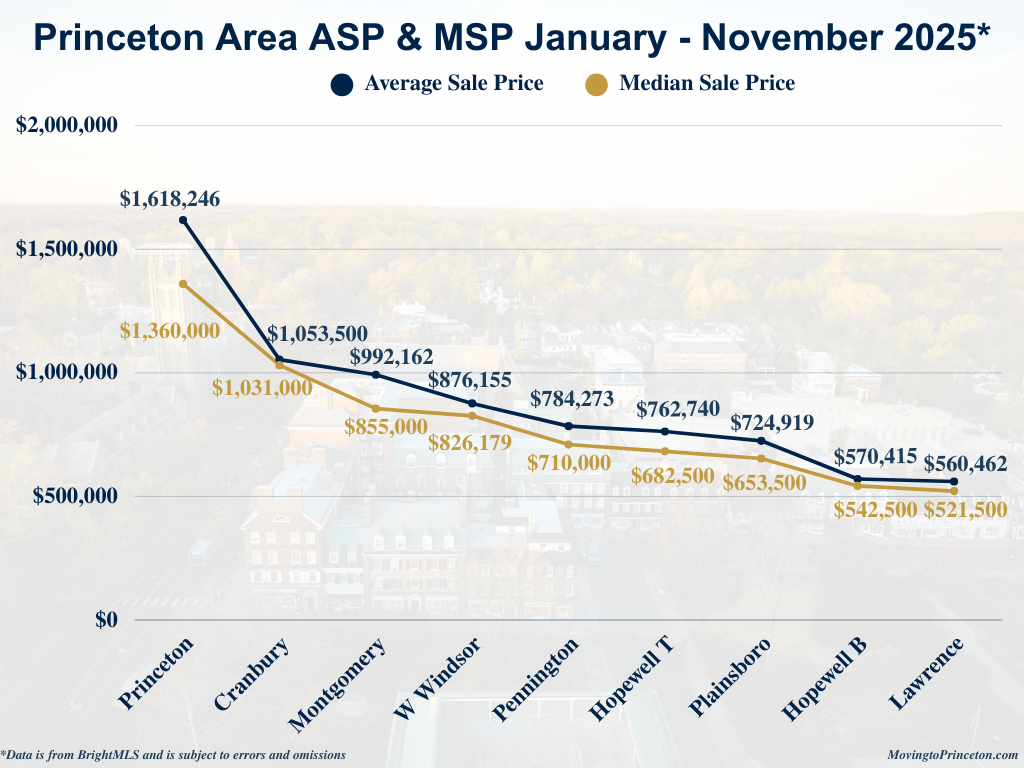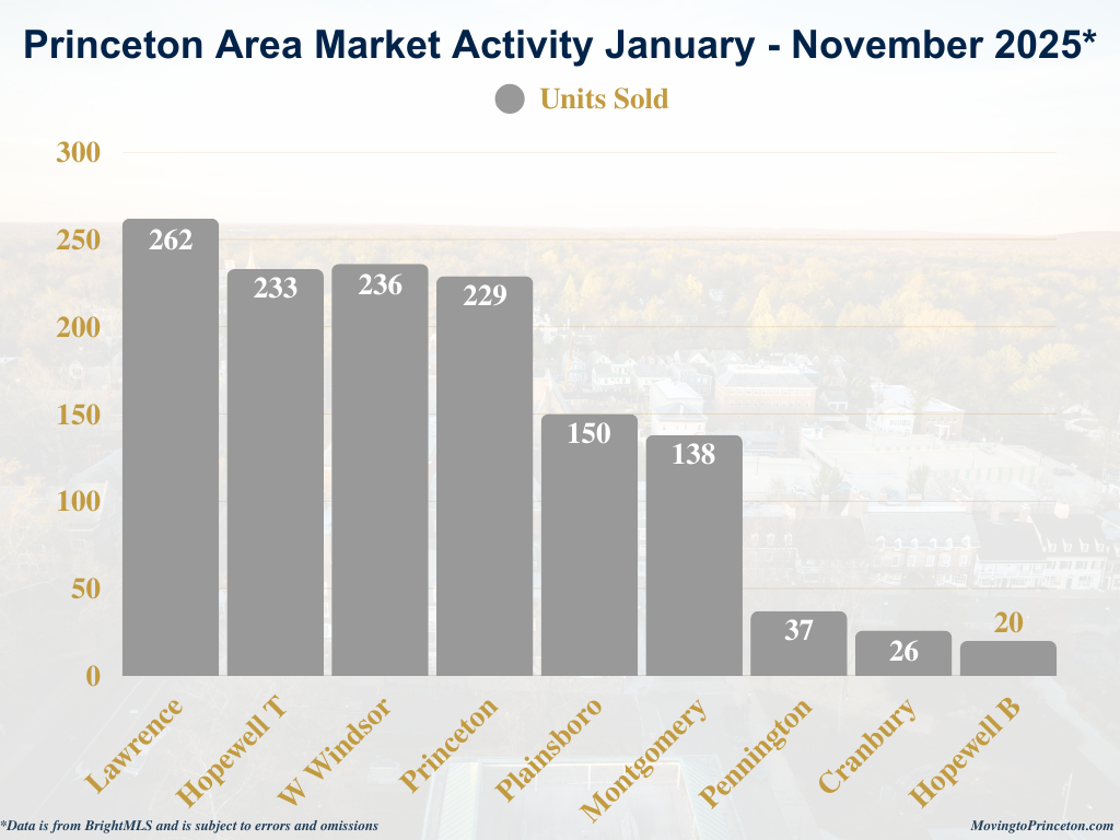 On a year-to-date basis, Princeton’s real estate market continues to demonstrate resilience. Through November 2025, Princeton recorded 229 Units Closed, up from 214 over the same period last year, representing the strongest performance since 2022. Units Listed increased to 306 from 291 (+5%), while Units Pended rose slightly to 235 from 232 over the same January-through-November period in 2024. The Average Days on Market edged up to 42 from 35 in 2024 (+20%) but remains well below pre-pandemic norms. Combined these figures reflect a market that has cooled from pandemic extremes yet remains structurally strong and balanced.