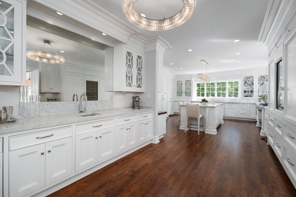 The brick breakfast room’s built-in BBQ is a rustic alternative to the brilliant white kitchen with marble countertops, custom glass cabinetry and paneled appliances – truly, the height of culinary elegance, complete with a full-size wine fridge and a double Thermador range.