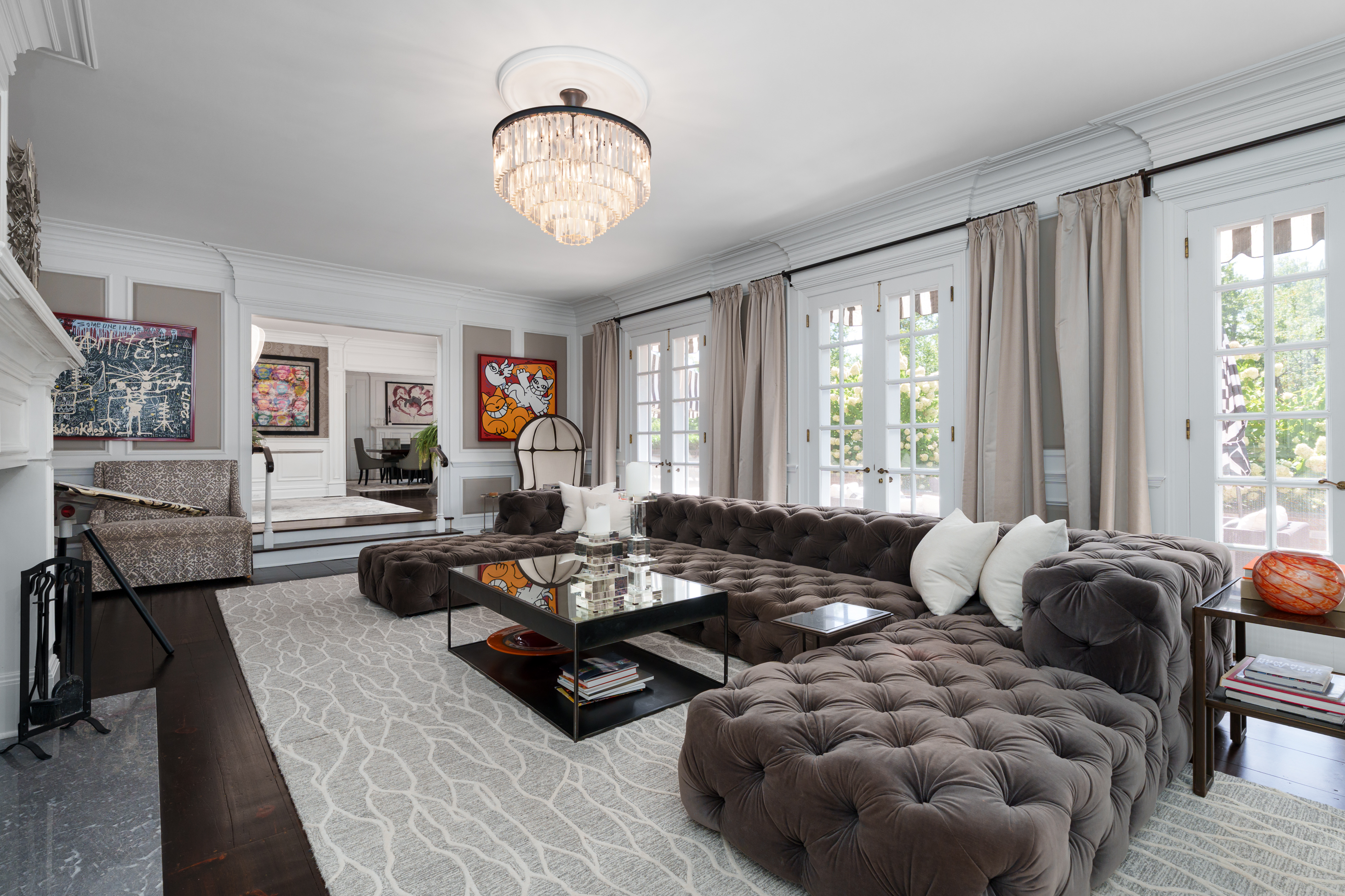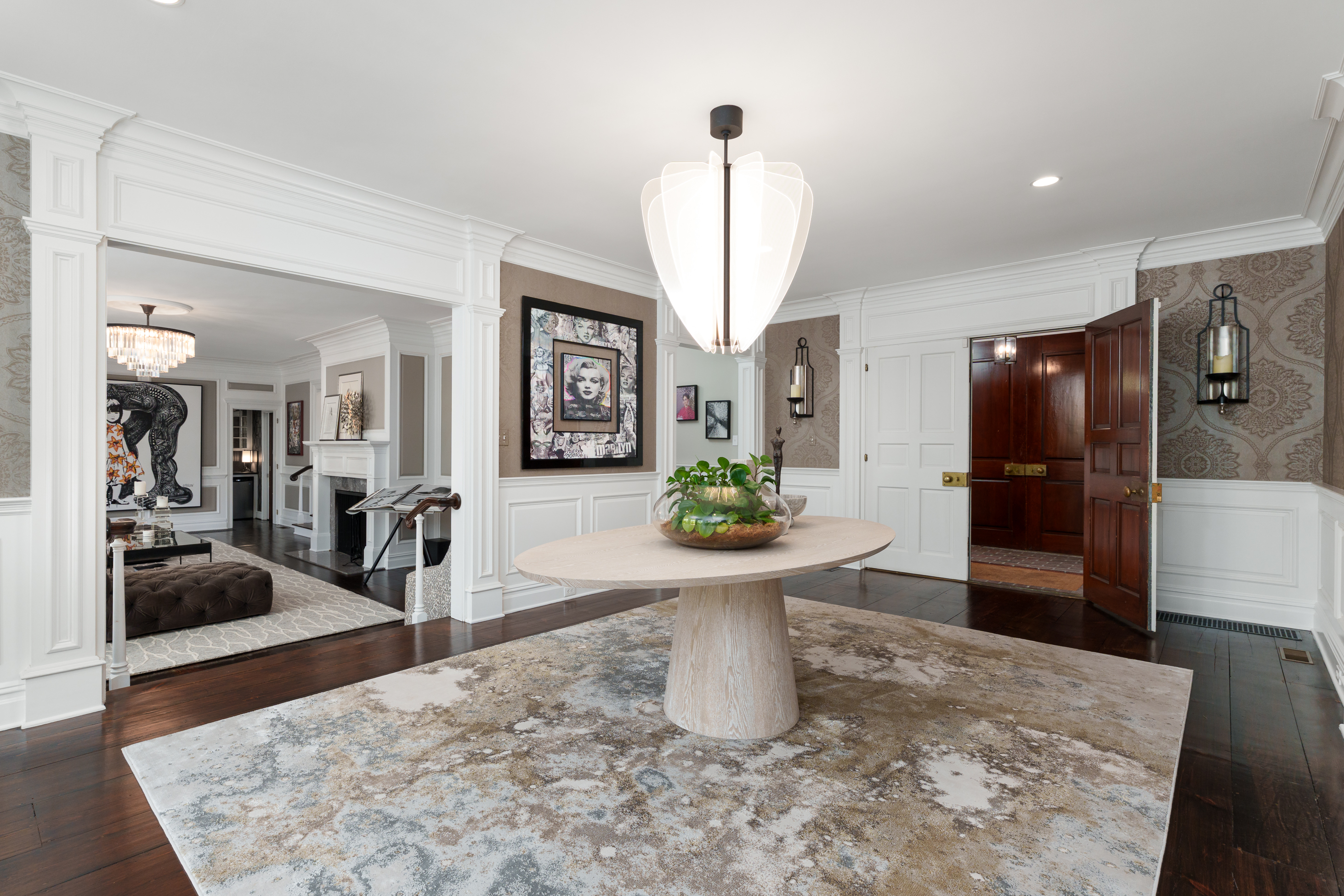 The classic Georgian brick house was built for a legendary sports franchise owner, who frequently entertained on a grand scale. Currently, an avid art collector uses the expertly renovated spaces to showcase contemporary works surrounded by traditional architectural features, like layered moldings, French doors and wide-plank antique floors.
