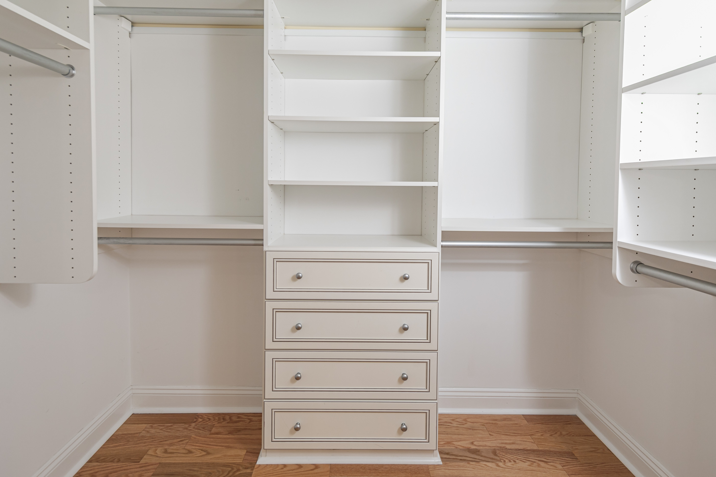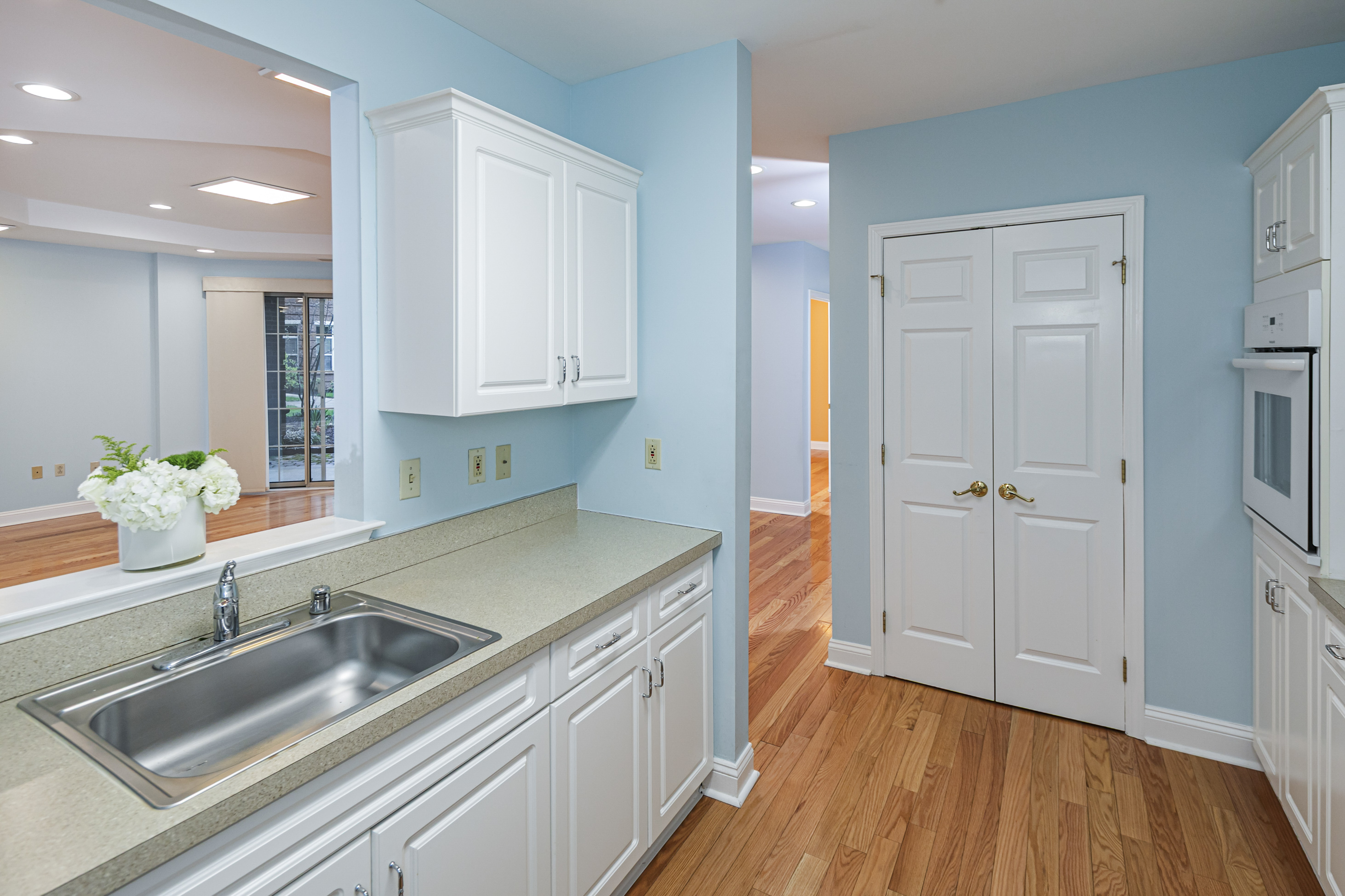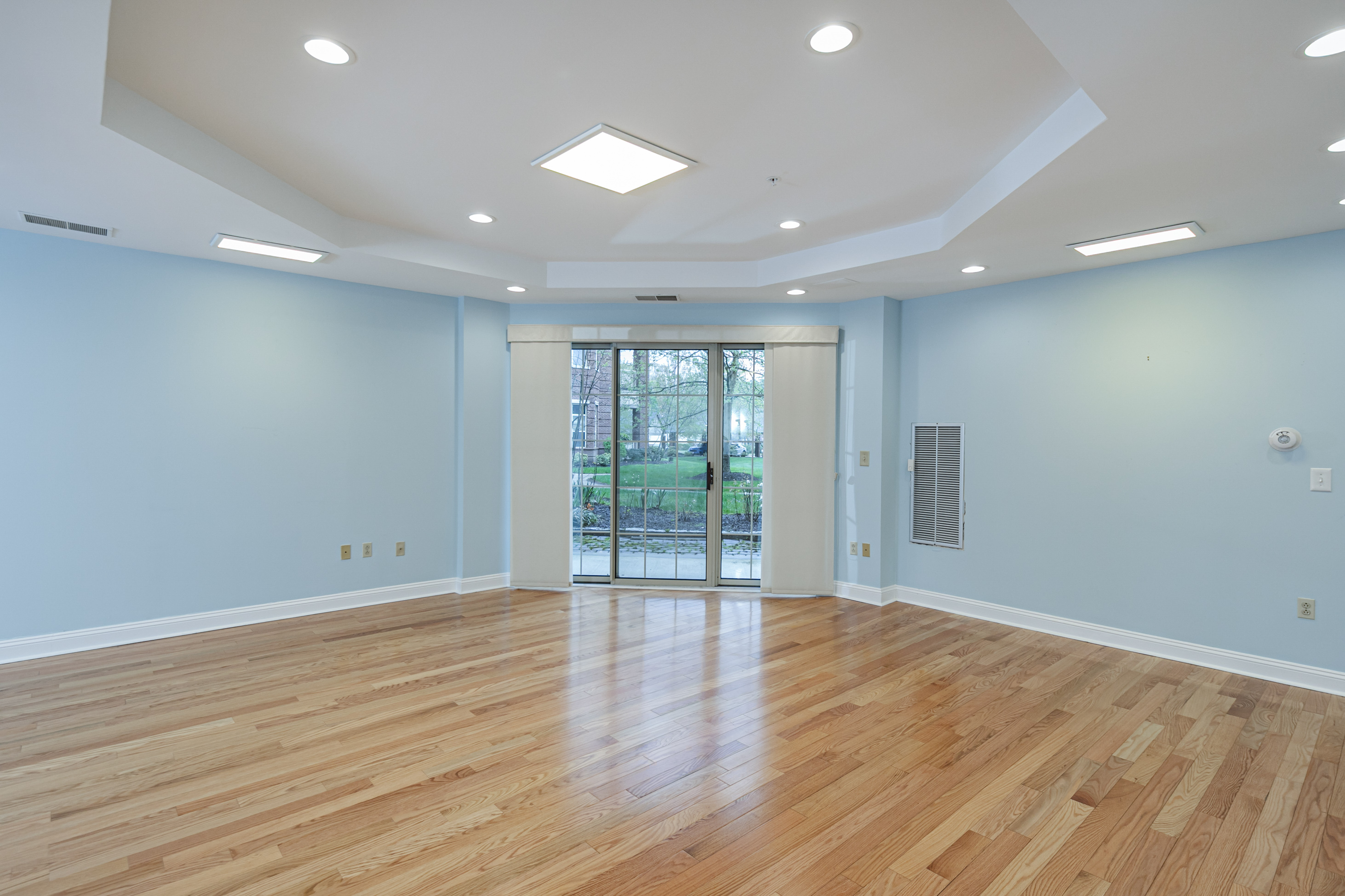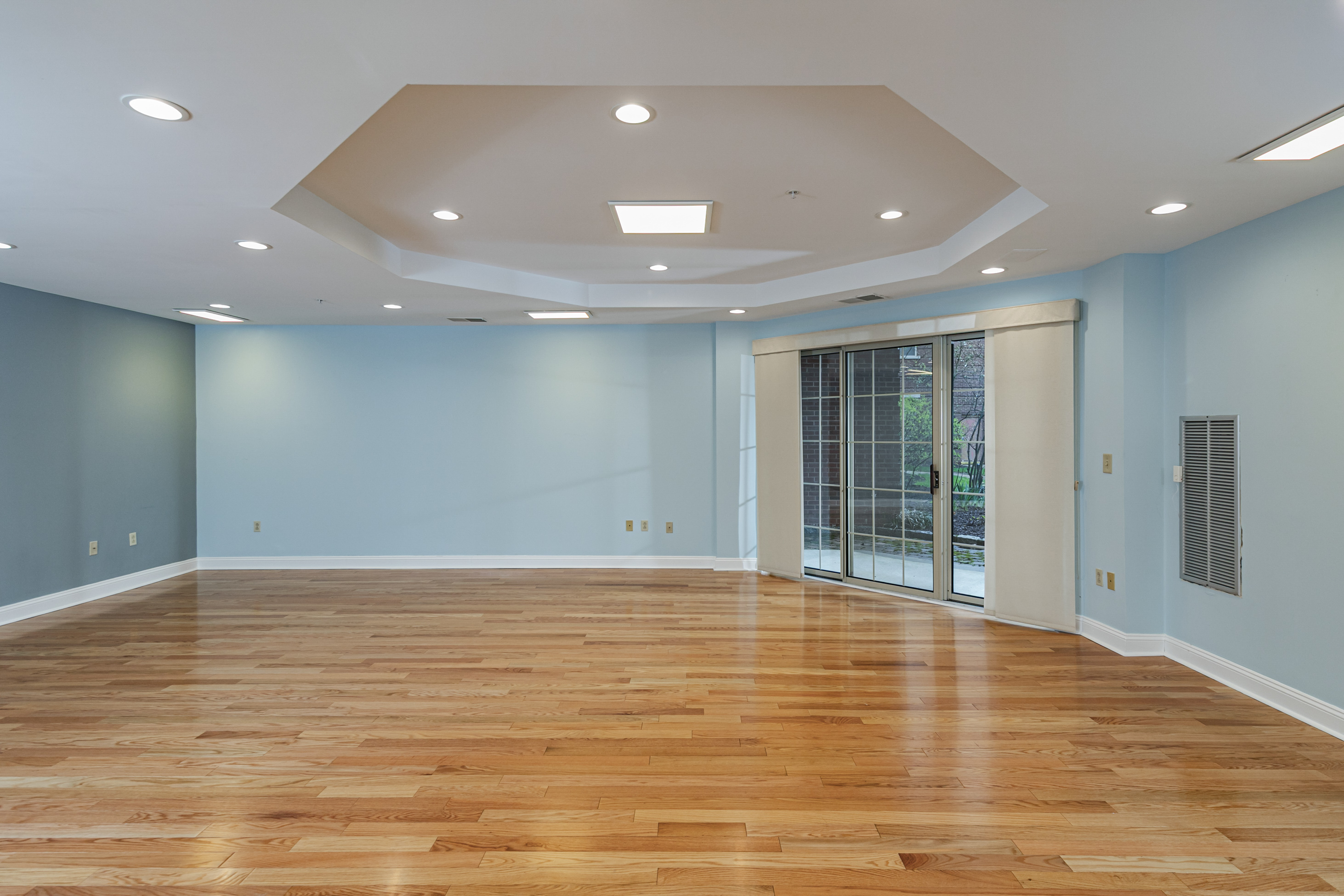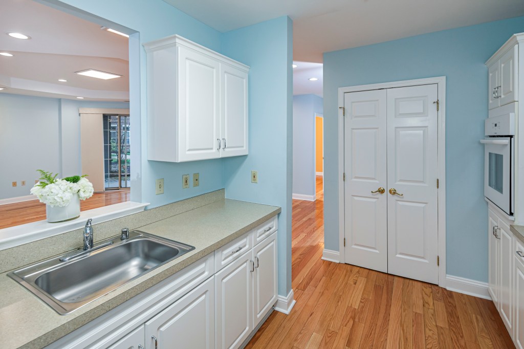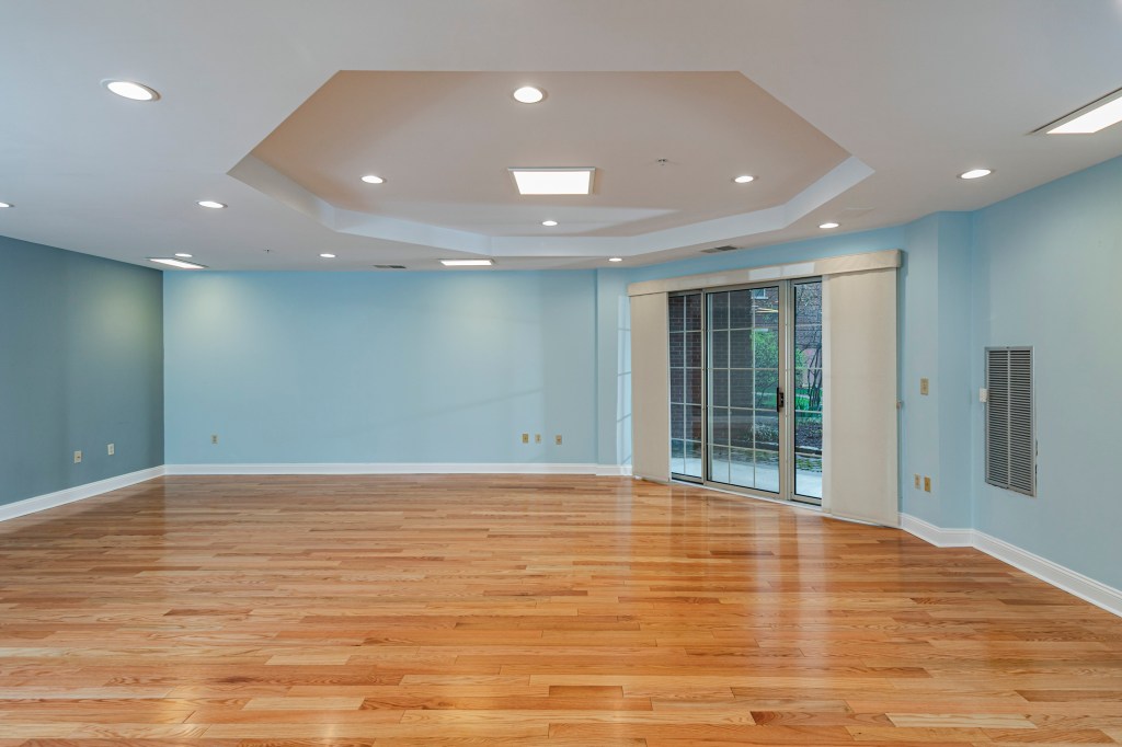 Inside, the layout feels open and airy, enhanced by real hardwood floors, tall tray ceilings and abundant recessed lighting.